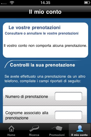 Infine abbiamo la sezione “Il mio Conto“, dalla quale poter visualizzare lo stato delle nostre prenotazioni o accedere alla lista degli hotel preferiti.