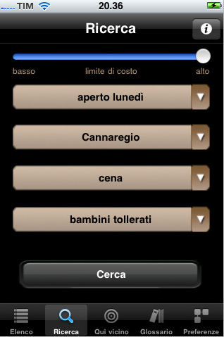Oltre alla possibilità di sfogliare le singole schede, l’utente può ricercare un qualsiasi locale tramite parole chiave o scelta multipa in base alla tipologia di locale desiderato), come “aperto fino a tardi”, “adatto ai bambini”, “elegante”, ecc…