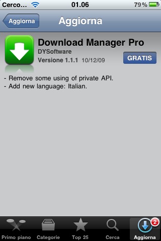 Per quanto riguarda “Download Manager Pro” (applicazione che consente di scaricare su iPhone i alcuni file dal web), invece, abbiamo finalmente la localizzazione in italiano e la rimozione di tutte le API private.