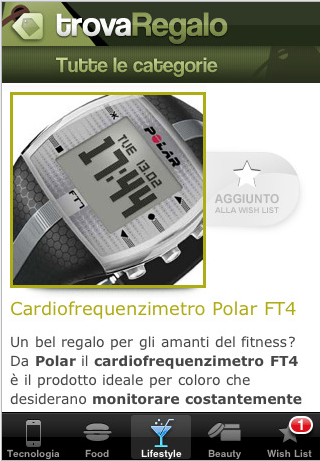 Disponibile su AppStore al prezzo di 0,79€, TrovaRegalo consente di visualizzare una serie  di categorie nelle quali cercare un regalo (tecnologia, Food, Lifestyle, Beauty).