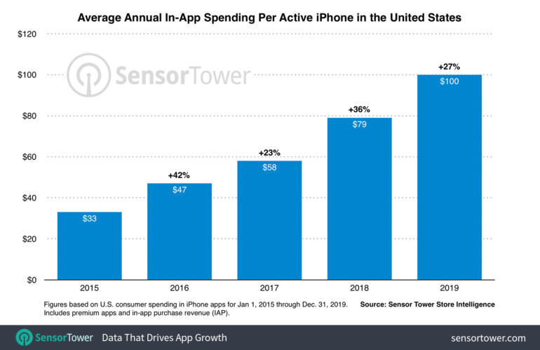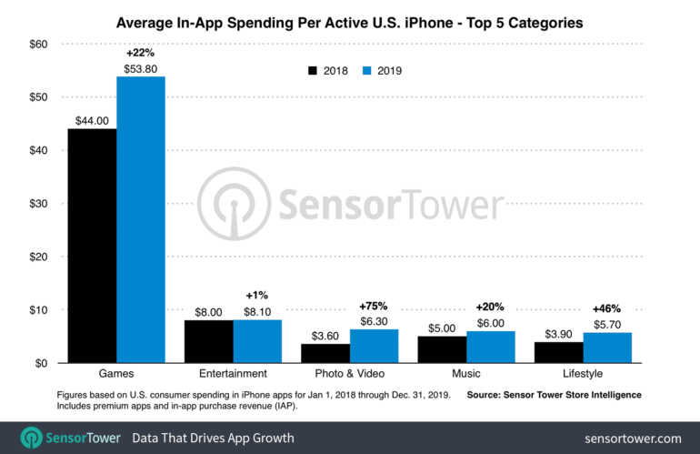 Nel 2019 i giochi per dispositivi mobili rappresentavano circa il 54% della spesa per app negli Stati Uniti con una stima di 53,80 dollari, un importo che è cresciuto del 22% rispetto al 2018, dove si attestava intorno ai 44 dollari. La spesa dei consumatori in giochi per iPhone è aumentata di quasi 31 dollari rispetto al 2015, dove invece segnava una media di 23 dollari, con un incremento di quasi il 134%.