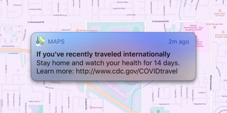 Apple Maps sta inviando delle notifiche push per ricordare ai viaggiatori di mettersi in quarantena preventiva per 14 giorni dopo un viaggio internazionale, stando alle linee guida del CDC.