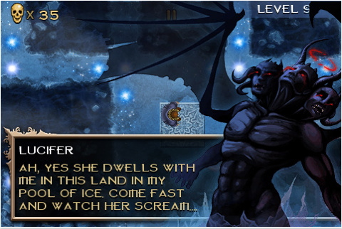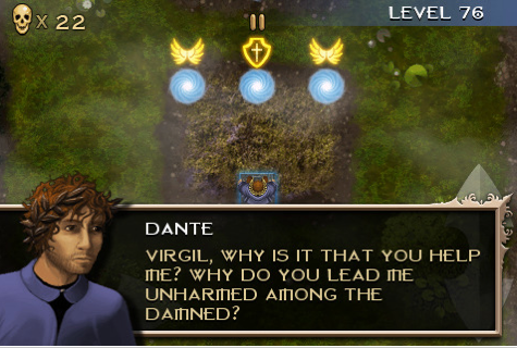 Nei panni di Dante dovremo quindi superare 5 cerchi dell’Inferno per completare il gioco, aiutati da Virgilio che ci guiderà in ogni singolo livello. I dialoghi con Virgilio fanno anche da contesto per raccontare la storia del gioco.
