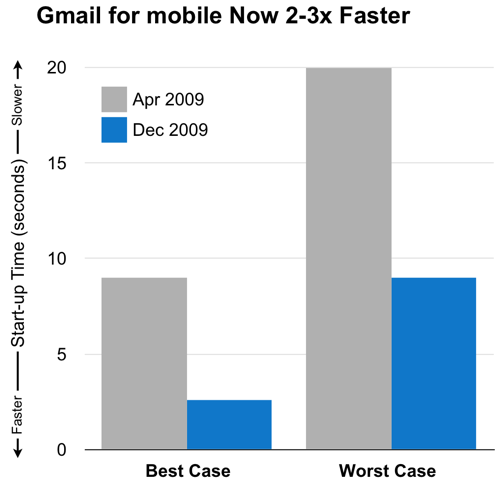 Google annuncia di aver lavorato alla versione Gmail per ottimizzarne la velocità, che ora è dalle 2 alle 3 volte superiore rispetto a prima.