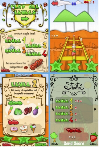 Il secondo gioco si chiama “Greedy Mountains” (Montagne golose). Il bambino dovrà, in una sorta di “tap tap alimentare”, prendere i vari cibi che scendono dalle montagne russe. Attraverso vari livelli il bambino potrà imparare a mangiare molta frutta, a lavarsi i denti, a fare attività fisica, ecc.