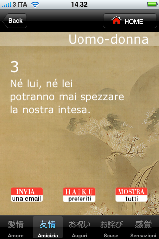 - Haiku categorie: la raccolta vera e propria di haiku che potremo invare via mail o salvare tra i preferiti per rileggerli velocemente;