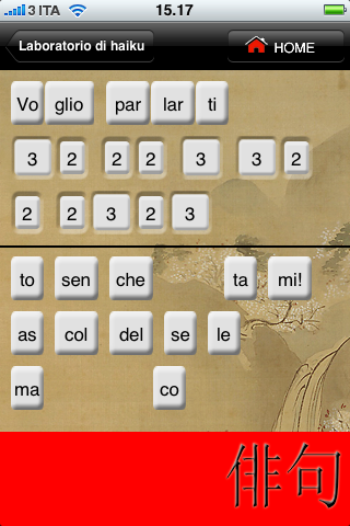 - Haiku laboratorio: una sezione dove poter giocare con gli haiku, avremo delle sillabe sparse e degli spazi dove inserirle per formare una terzina; questo ci permetterà attraverso 20 livelli di apprendere l’arte degli Haiku e, dopo averne composti dei nostri, di spedirli agli sviluppatori per essere inseriti nell’applicazione con i prossimi aggiornamenti.