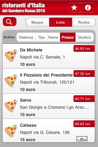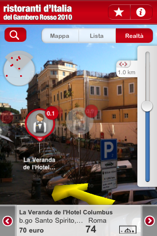 - Realtà: una chicca per tutti i possessori di iPhone 3GS, che possono visualizzare la posizione dei ristoranti tramite realtà aumentata. Muovendo il cursore sulla destra possiamo anche aumentare il raggio di ricerca.