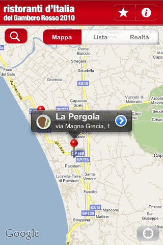 - Mappa: per consultare la mappa (Google) e visualizzare immediatamente la presenza di ristoranti recensiti da Gambero Rosso, sia nelle vicinanze (sfruttando il GPS), sia spostando manualmente la mappa stessa.