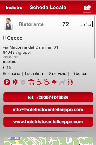 Per ogni ristorante presente nella guida è possibile leggere una scheda completa, con indirizzo, numero di telefono, prezzo indicativo, giornata di chiusura, servizi offerti, posizione su mappa, sito, email, specialità della casa e soprattutto leggere la recensione di Gambero Rosso.