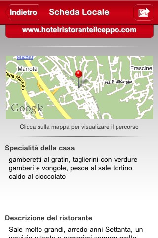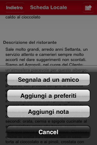 L’utente può poi inviare la scheda ad un amico, aggiungere una nota o inserire il ristorante tra i preferiti. Logicamente è anche possibile effettuare una ricerca, sia per indirizzo che per nome del ristorante.