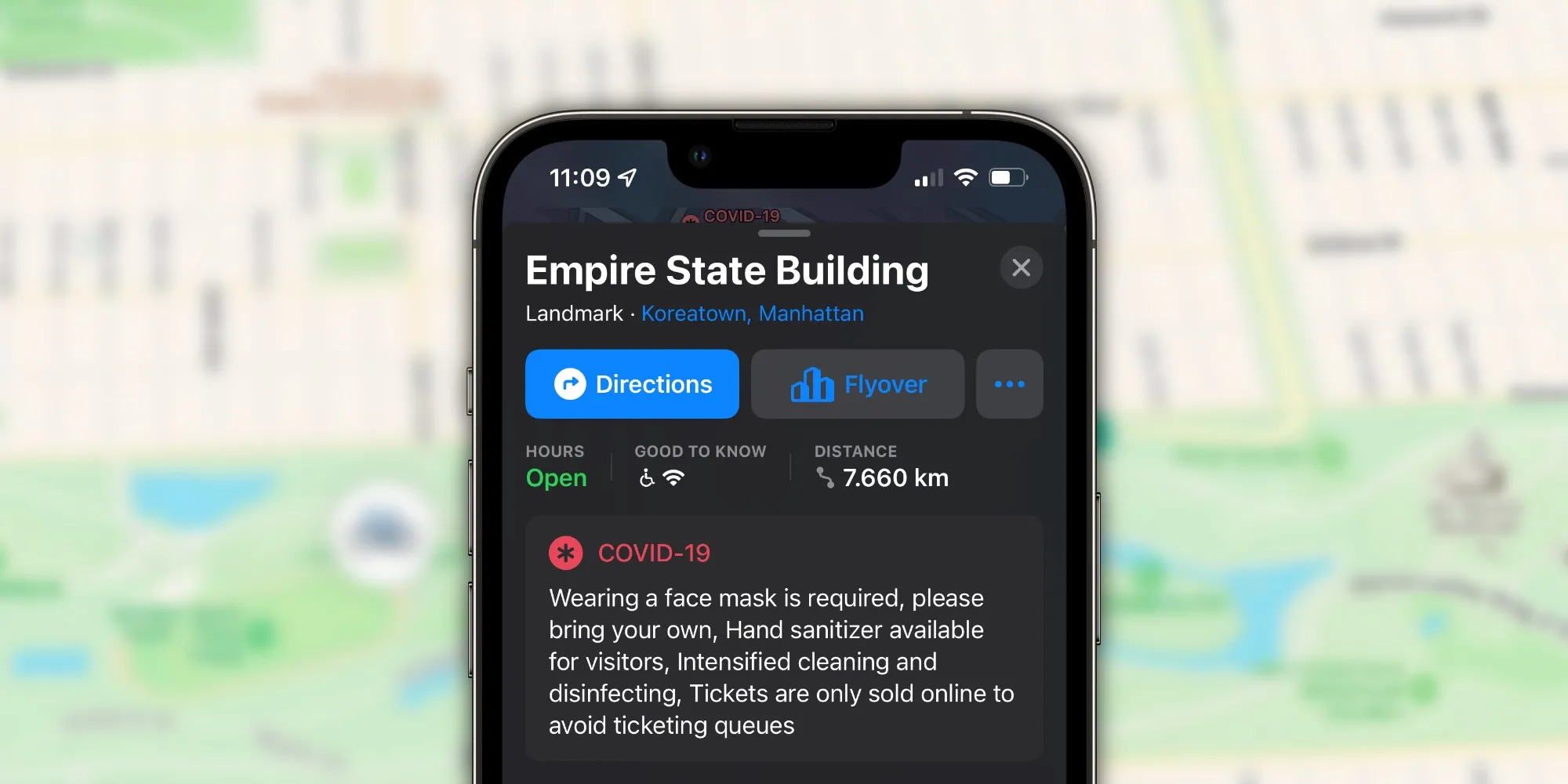 Ad esempio, quando si cerca l’Empire State Building, Apple Maps spiega che è necessario “indossare una maschera facciale e disinfettare le mani. I biglietti sono venduti solo online per evitare code in biglietteria”.