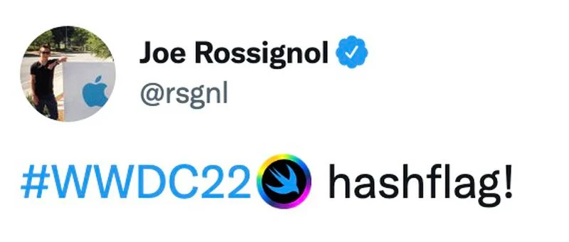 Inoltre, l’hashflag del WWDC 2022 è stato pubblicato anche su Twitter per l’hashtag #WWDC22. Ricordiamo che un hashflag è una piccola icona che appare accanto agli hashtag nei tweet, con quello della WWDC 2022 costituito dall’icona Swift di Apple in un cerchio delineato con i colori dell’arcobaleno.