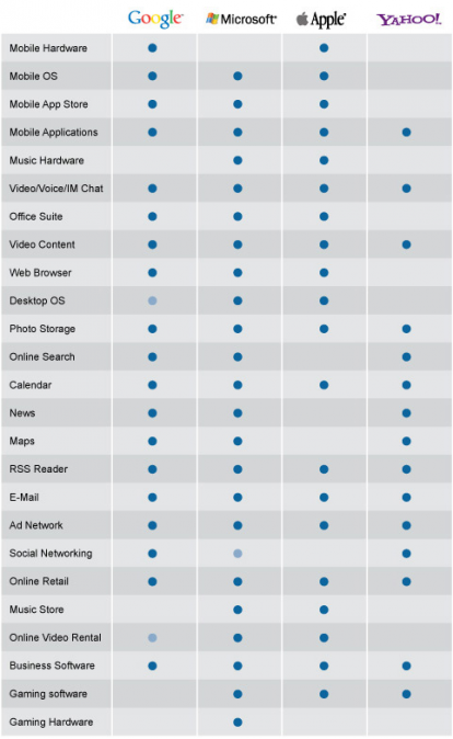 Il New York Times ha pubblicato un’immagine nella quale vengono confrontati quattro colossi dell’informatica al fine di visualizzare i servizi che ognuno di loro offre: stiamo parlando di Google, Microsoft, Apple e Yahoo!