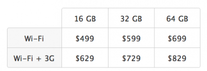 Ricordiamo che l’iPad, di cui abbiamo ampiamente parlato qui, sarà disponibile a fine marzo (per ora solo negli USA) con prezzi che vanno dai 499$ del modello da 16Gb senza connessione 3G agli 829$ del modello da 64Gb con connessione 3G (disponibili anche varie offerte per il traffico dati con operatore AT&T).
