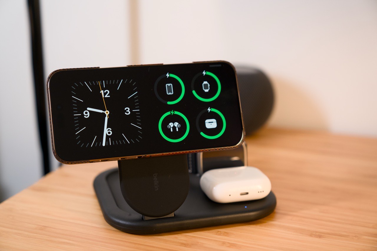 Il BoostCharge 3-in-1 Magnetic Foldable Charger di Belkin è un supporto di ricarica ideale per iPhone con MagSafe, Apple Watch ed AirPods e rappresenta una soluzione ottimale per mettere ordine sul comodino, sul tavolo o sulla scrivania e ricaricare con un solo cavo USB-C e un solo alimentatore a muro ben tre dispositivi.