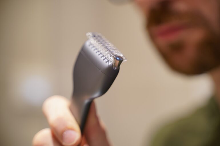 Un’altra caratteristica interessante è l’angolo di rasatura di 148,5°, che permette alla lama di mantenere un contatto ottimale con la pelle anche nelle aree più difficili da raggiungere come il contorno labbra o sotto il mento.