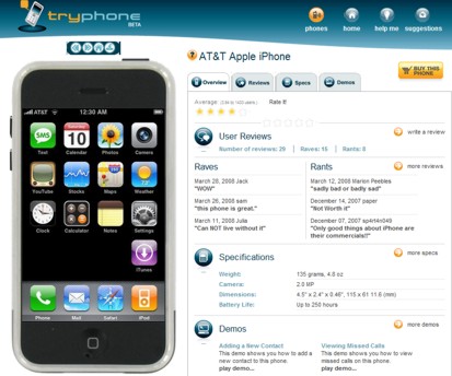 Siete indecisi se acquistare l’iPhone? Andate sul sito TryPhone e verificate alcune funzionalità base del melafonino. Sicuramente non avete la possibilità di verificare appieno la potenzialità del touch, ma il servizio offerto è comunque una bella iniziativa. Per ora, sul sito potete visualizzare l’interfaccia grafica dell’iPhone, del Nokia N95, del Palm Centro e del HTC Diamond.