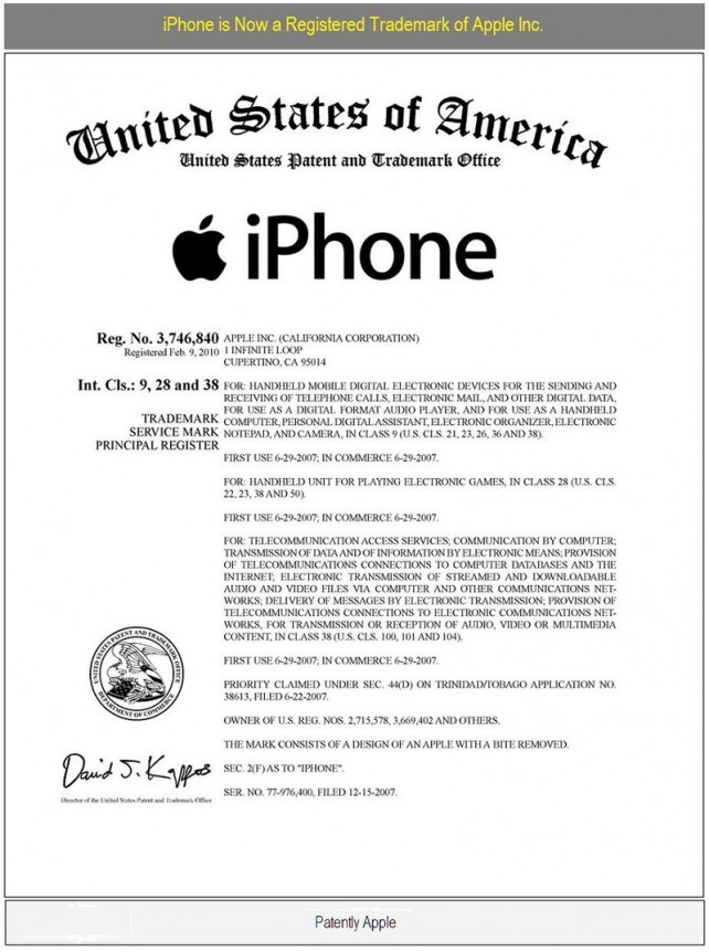 iPhone is a registered trademark of Apple Inc. – officially as of Feb 09, 2010. The registration number 3,746,840 covers International Classes 9, 28 and 38 which are presented in this report for clarification.