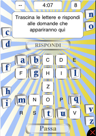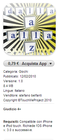 Dalla A alla Z è un simpatico giochino da poco disponibile in AppStore: dovremo riuscire ad inserire nelle caselle centrali corrispondenti, tutte le lettere dell’alfabeto che trovereme ai lati nel tempo massimo di 8 minuti.