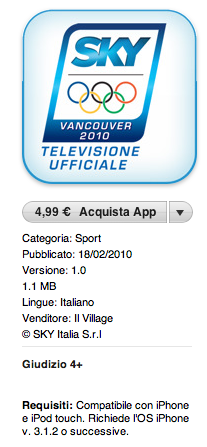 Se non volete perdere proprio nulla delle Olimpiade invernali arriva per voi l’applicazione ufficiale del canale Sky dedicata proprio a Vancouver 2010. Si tratta dell’unica applicazione, in italiano, dedicata a questo evento e che consente di visualizzare LIVE, 24 su 24, il canale principale dedicato alla manifestazione (canale 206 su Sky).