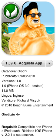Belly Bums, come avrete facilmente intuito dall’immagine, è una variante molto originale della normale beach volley in cui, invece delle mani e delle braccia, si usa la propria abbondante pancia per colpire la palla. I movimenti sono automatici, ma sarete voi a decidere direzione, e potenza del colpo: la direzione la decidete sfiorando la parte destra dello schermo, mentre la potenza varia a seconda se colpite la palla mentre siete in ascesa o in discesa.